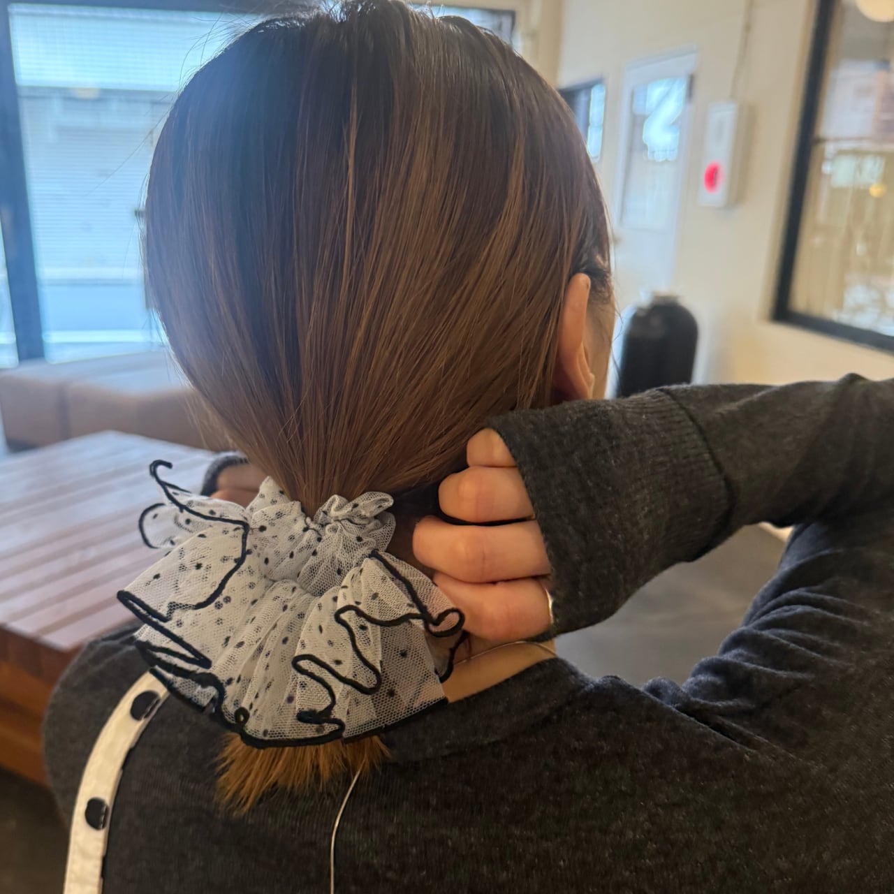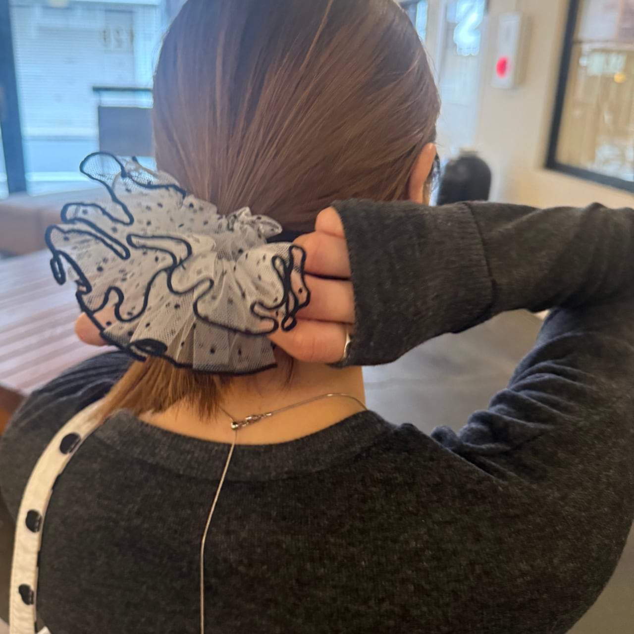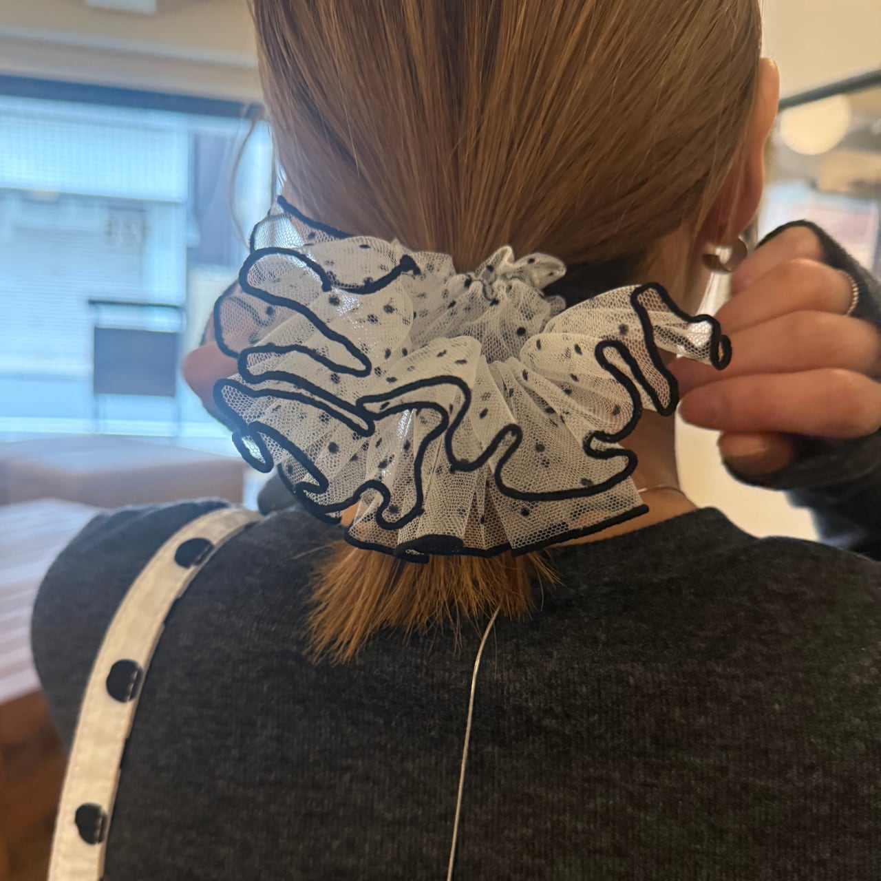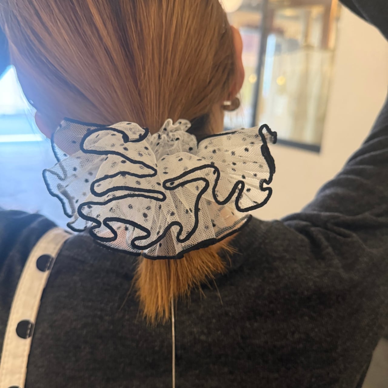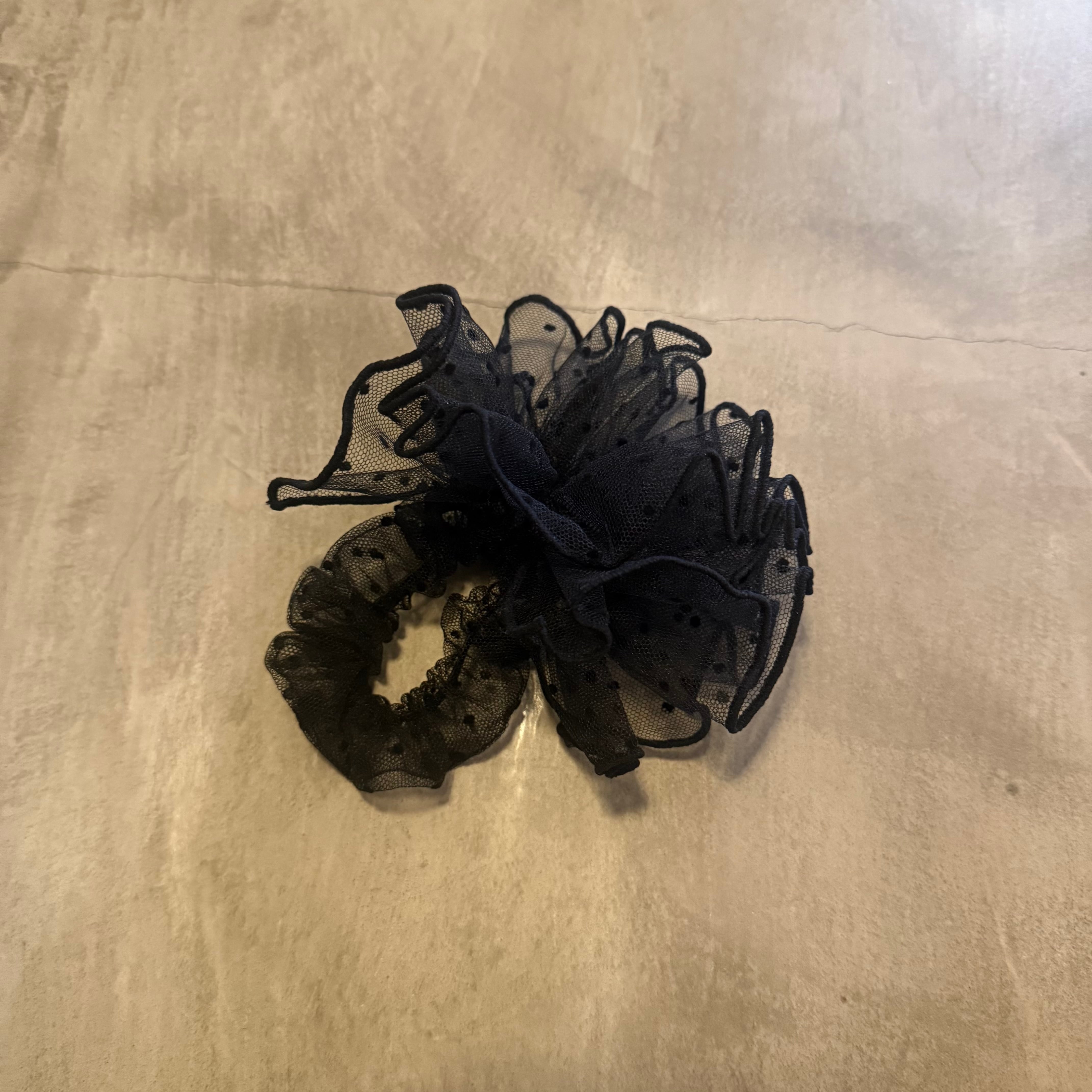 チュール素材のフリルデザインシュシュ。