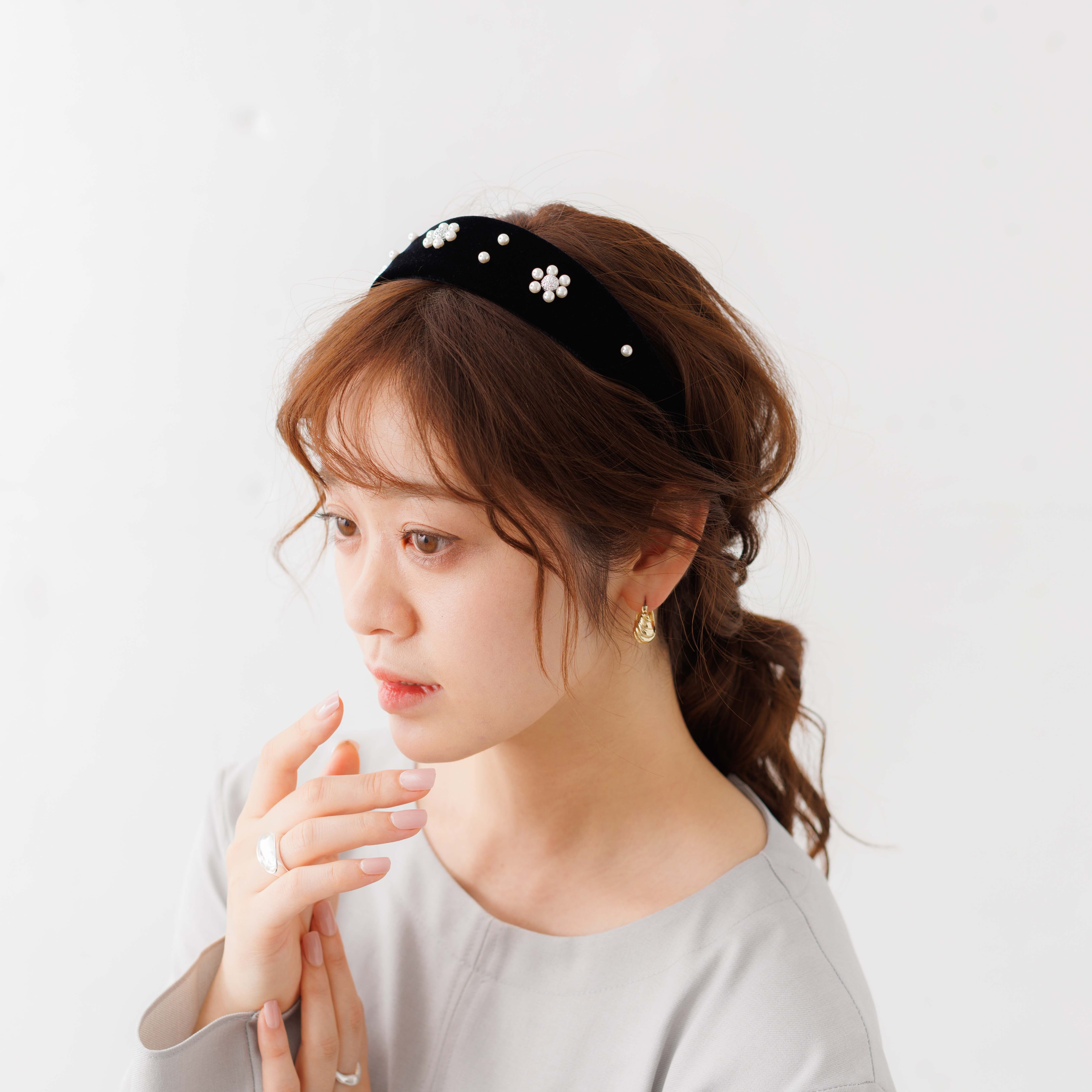 ベロア素材のパールフラワー付カチューシャ。